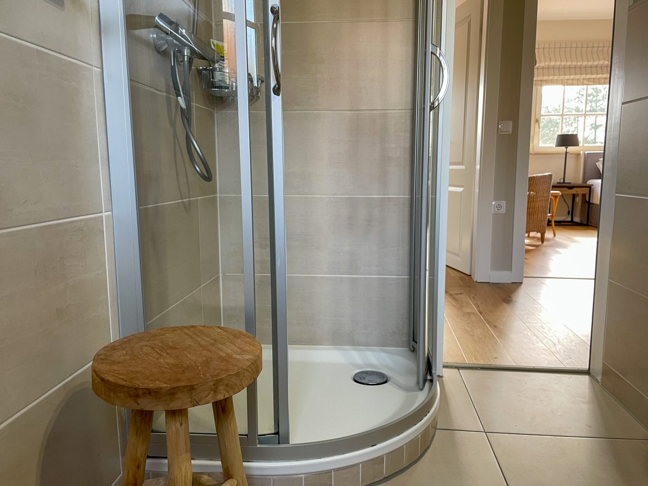 mit Glasdusche, Waschtisch, WC, Kosmetikspiegel und Fön